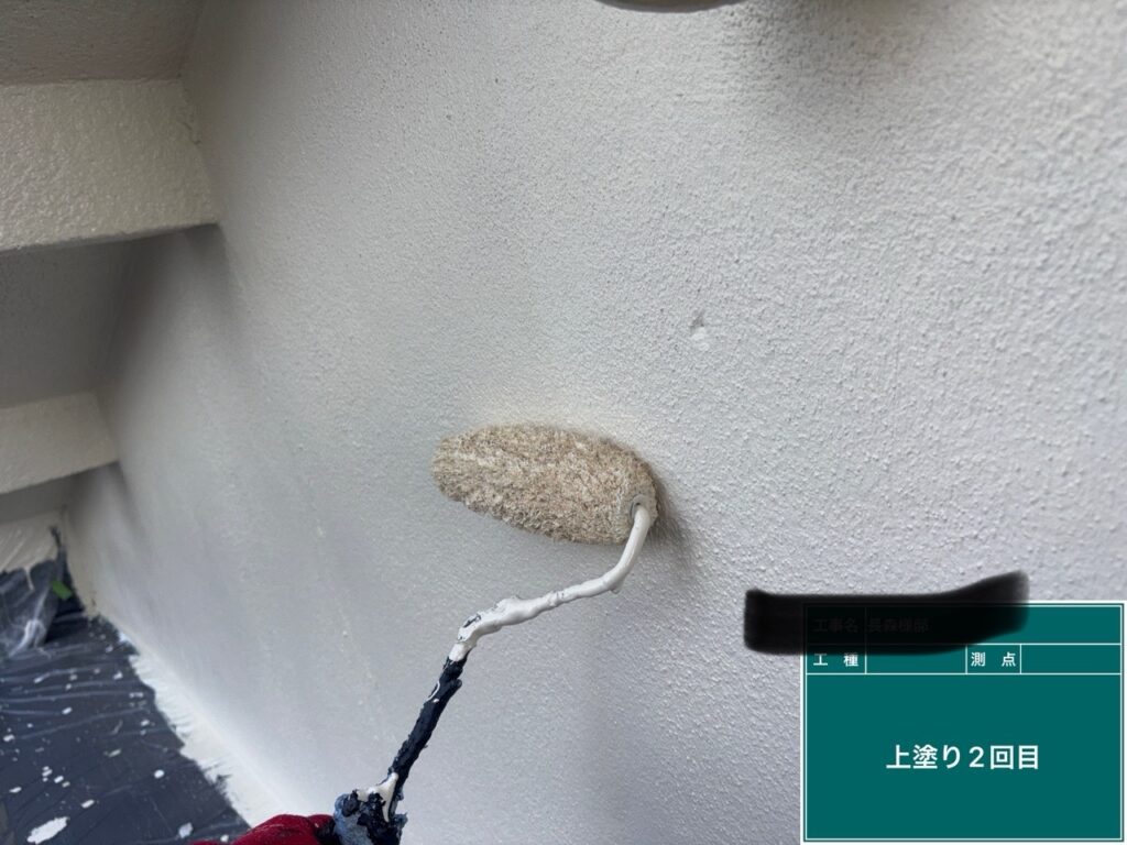 上塗りを2回塗ることで耐久性・美観性があがり、艶も綺麗で強い外壁に仕上がります✨