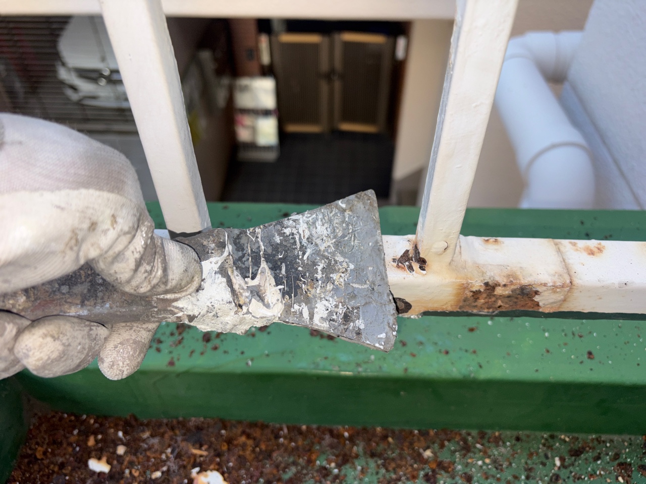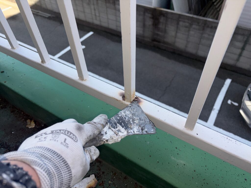 かなり錆びていて穴も空いてるくらいの手摺なのですがしっかりケレンしていきます💪